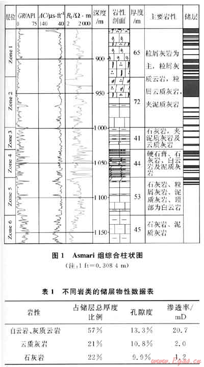 根據(jù)測井解釋(表1),白云巖類儲層所占比例高,孔隙度、滲透率高,物性好,是主要的儲集巖類,這與MIS構(gòu)造Asmari組主要為石灰?guī)r儲層的傳統(tǒng)認(rèn)識有差別[1]。