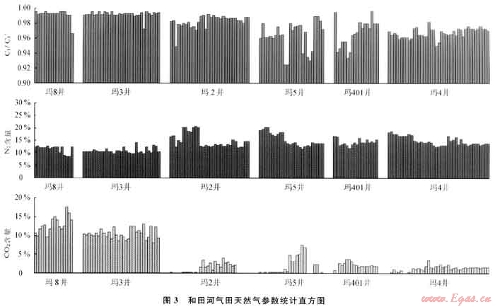 東西分段特征。同一井區(qū)不同井間天然氣組分也有一定差異,瑪4、瑪5井的CH4含量、C02含量差異較大,可能不是同一氣藏。