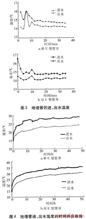 對(duì)單U型管井和雙U型管井均進(jìn)行了熱響應(yīng)測(cè)試。測(cè)試時(shí)保持每口井的加熱功率和供水流量穩(wěn)定,分別記錄48h的進(jìn)、出水溫度。進(jìn)、出水溫度的時(shí)間響應(yīng)曲線見圖4。由圖4可知,經(jīng)過一段時(shí)間后,地埋管的進(jìn)、出水溫差基本穩(wěn)定,表明地下?lián)Q熱已基本達(dá)到了平衡。此時(shí)計(jì)算得單、雙U型管的平均換熱量分別為47.59、86.44W/m。