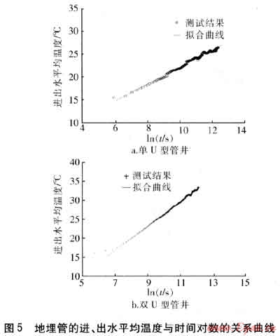 待地埋管進(jìn)、出水溫差穩(wěn)定后,擬合其平均溫度Tf與時(shí)間對(duì)數(shù)㏑t的關(guān)系曲線,見圖5。單U型管井?dāng)M合曲線公式為Tf=1.866 8㏑t+4.0142,雙U型管井?dāng)M合曲線公式為Tf=3.1964㏑t-5.5206,可得擬合曲線的斜率和截距。