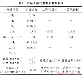 針對高含硫、含碳天然氣的凈化新工藝技術在普光氣田得到成功的應用。從2009年10月普光天然氣凈化廠第一聯(lián)合裝置順利投產以來,目前全廠6套聯(lián)合裝置均已開車成功,裝置運行平穩(wěn),主要工藝技術指標、產品質量指標達到設計要求,硫磺回收率高于99.8%,尾氣排放中S02低于960mg/m3,滿足GB 16297—1996環(huán)保要求。運行1年多來,凈化天然氣產品質量超過了設計要求的《天然氣》(GB 17820—1999)二類氣標準,達到一類氣標準。目前的產品氣技術質量指標見表2。