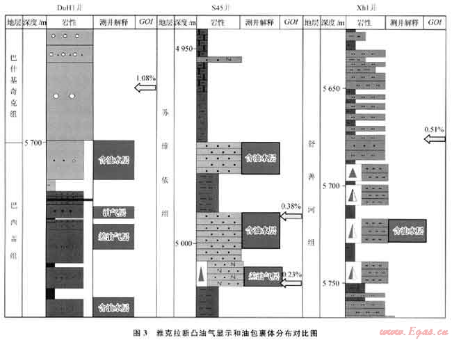 結(jié)合該區(qū)大量鉆井資料和流體包裹體系統(tǒng)檢測發(fā)現(xiàn),存在“斷接式”輸導(dǎo)體系的井區(qū)宏觀油氣顯示和微觀有機包裹體豐度(GOI,即賦存于有機包裹體的石英顆粒在所有石英顆粒中所占的比值),相比于其他井普遍較好,如:S45井在N1s宏觀上為含油層系,微觀上檢測到發(fā)黃色熒光的油包裹體和大量發(fā)弱白色熒光的氣包裹體,GOJ值范圍為0.23%~0.38%;Xh1井K1s為差油氣層,微觀上在K1b檢測到大量發(fā)亮黃色、橙黃色和藍(lán)白色熒光的油包裹體,GOI值為0.51%;DuH1井K1b為較好的含油氣層,微觀上在K1s、K1b則同時檢測到大量發(fā)黃色熒光的油包裹體和發(fā)弱白色熒光的氣包裹體,GOI值為1.08%(圖3)。