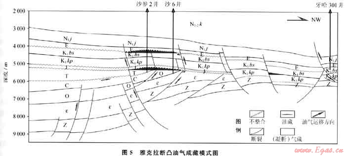 下白堊統(tǒng)沉積后,在下伏古生界侵蝕斷塊殘丘控制下,經(jīng)燕山晚期-喜山早期運動改造形成背斜圈閉,該區(qū)及臨區(qū)古生界烴源巖在海西晚期-燕山晚期成熟的油氣沿不整合面?zhèn)认蜻\移,聚集于當(dāng)時區(qū)域構(gòu)造高部位——雅克拉斷凸帶;而燕山晚期輪臺斷裂的逆沖活動使油氣能夠繼續(xù)向上運移至白堊系圈閉,但由于當(dāng)時缺乏封蓋條件,油氣全部逸散,僅殘存少量瀝青。