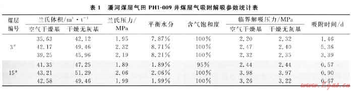 PH1-009井等溫吸附實(shí)驗(yàn)溫度采用儲(chǔ)層溫度,平衡水分條件,測(cè)試結(jié)果表明,區(qū)內(nèi)3#、15#煤層對(duì)甲烷具有很強(qiáng)的吸附能力。如表1所示,3#煤層蘭氏體積介于35.63~42.17m3/t,平均為39.02m3/t,蘭氏壓力介于1.95~2.32MPa;15#煤層蘭氏體積介于41.35~43.21m3/t,蘭氏壓力介于1.89~2.06MPa。15#煤層吸附能力高于3#煤層。吸附時(shí)間,3#煤層為3.39d,15#煤層為0.67d。煤層含氣飽和度均很高,除15#煤層的一個(gè)樣品為95%外,其余都是100%。