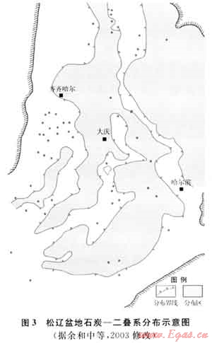 2) 松遼盆地周緣地區(qū)近年來經(jīng)中國石油化工集團公司及吉林大學(xué)等單位研究后認(rèn)為:東北地區(qū)古生界為一套裂陷-克拉通盆地沉積,古生界分布廣泛(圖3),沒有區(qū)域性變質(zhì),烴源巖十分發(fā)育。通過地質(zhì)調(diào)查,確定在東北地區(qū)東部的磐石、西部的東西烏旗、呼倫貝爾盟和興安盟等地區(qū),晚古生界發(fā)育4套烴源巖系[3]。