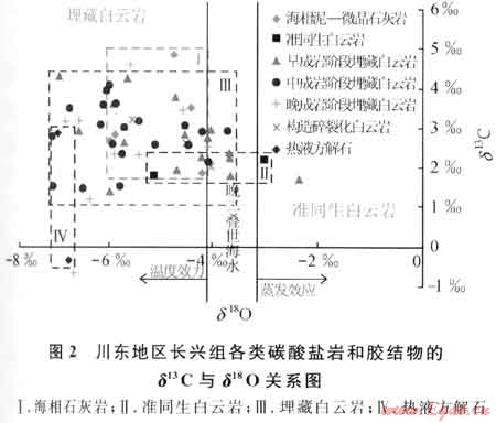 3) 由碳、氧同位素組成隨成巖強(qiáng)度加大而負(fù)偏值加大的變化趨勢,可確定早成巖階段埋藏白云巖化發(fā)生在低溫流體中,而中、晚成巖階段白云巖化和構(gòu)造隆升期白云巖碎裂化和重結(jié)晶作用發(fā)生在溫度逐漸升高的成巖流體中[19]。