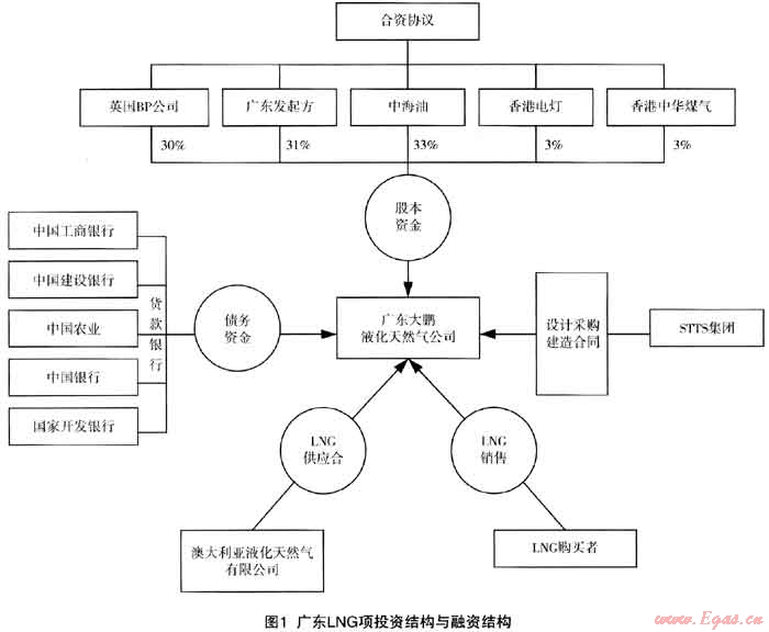 廣東LNG項(xiàng)目采用的是公司型合資結(jié)構(gòu)(Incorporated Joint Venture),投資者根據(jù)合資協(xié)議認(rèn)購合資公司即項(xiàng)目公司股份。項(xiàng)目公司各發(fā)起方和投資者的持股比例為:中海油33%,廣東發(fā)起方31%(深圳市投資管理公司14%,廣東省電力集團(tuán)公司6%,廣州市煤氣公司6%,東莞市燃料工業(yè)總公司2.5%和佛山市燃?xì)饪偣?.5%),英國BP公司30%,香港電燈集團(tuán)有限公司3%和香港中華煤氣有限公司3%。項(xiàng)目公司將作為LNG的總買方購買LNG,同時(shí)向各電廠和城市燃?xì)獾扔脩翡N售管道天然氣。