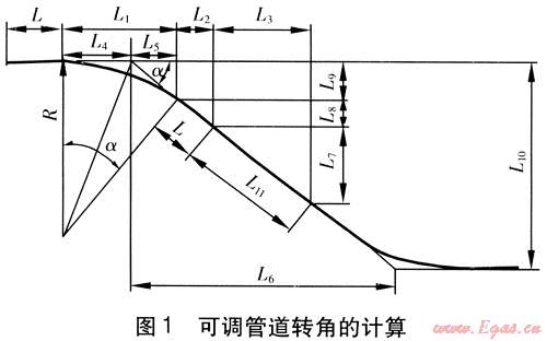 可調(diào)管道轉(zhuǎn)角的計(jì)算見(jiàn)圖1。