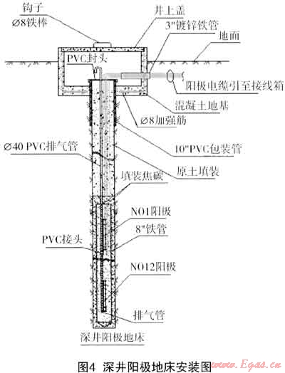 公司于2011年3月首先啟動(dòng)了區(qū)域二的深井陽極電流保護(hù)工程。經(jīng)計(jì)算管道保護(hù)面積為19631m2,設(shè)計(jì)保護(hù)電流密度為1OmA/m2,保護(hù)總電流為196A,在南浦氣化站和位于車站大道的公用集團(tuán)內(nèi)各設(shè)置1座深井陽極陰極保護(hù)站。每個(gè)站內(nèi)設(shè)100A/100V恒電位儀2臺(tái),一開一備。在站內(nèi)距離管線50m~1OOm的低洼潮濕、土層較厚處鉆建直立式陽極地床,井深60m,井內(nèi)裝分段預(yù)制型陽極體7組,規(guī)格為Φ325×6000,內(nèi)裝Φ75×1500高硅鑄鐵陽極3支。將高硅鑄鐵陽極、高性能碳素填料,PVC排氣管,部分陽極引線電纜,井套管組合裝配為一體,便于運(yùn)輸和安裝,并可保證裝配精度和質(zhì)量(圖4)。每500m左右設(shè)置一個(gè)測(cè)試樁或在原有閥門外內(nèi)設(shè)置測(cè)試點(diǎn)。對(duì)于平行或跨越管道按一定間距或在最接近處作均壓處理,使電位分布均衡。