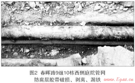 按照SY/T0087—95《鋼質(zhì)管道及儲(chǔ)罐腐蝕與防護(hù)調(diào)查方法標(biāo)準(zhǔn)》,破損缺陷≥8處/1Okm鋼質(zhì)管網(wǎng)評(píng)級(jí)為“差”。在公司長達(dá)130km埋地鋼質(zhì)管網(wǎng)中,共檢出防腐層破損缺陷303處,超過23處/km,顯然管道防腐層屬“差”的等級(jí)。開挖發(fā)現(xiàn)防腐層缺陷包括以下幾種形態(tài):(1)施工時(shí)未防腐;(2)施工時(shí)創(chuàng)傷(包括點(diǎn)狀和帶狀),此種情形占據(jù)了大部分,觸目驚心(見圖2);(3)防腐層經(jīng)長時(shí)間浸水起泡;(4)管線彎又、三通、四通等部位防腐施工質(zhì)量差;(5)入戶管線出土處腐蝕較普遍。防腐層缺陷處管道本體腐蝕包括點(diǎn)狀腐蝕和面狀腐蝕,其中以點(diǎn)狀腐蝕危害為重,嚴(yán)重處已穿孔漏氣。