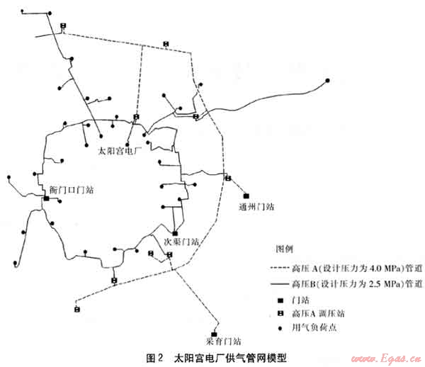 以北京市太陽宮天然氣發(fā)電廠為例,在建立北京市天然氣高壓管網模型的基礎上,對太陽宮電廠的兩臺9F機組在冬季用氣高峰進行啟停時的供氣管道水力工況進行動態(tài)模擬計算。建立的太陽宮電廠供氣管網模型見圖2,高壓A管道總長130km,高壓B管道總長180km。