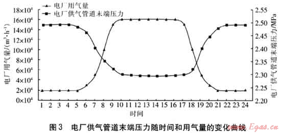 圖3的壓力變化曲線可以清楚地表明電廠運行的各時間段進氣管道末端壓力的變化,該壓力變化曲線圖為工程前期制定電廠供氣管道方案提供了重要的參考依據。