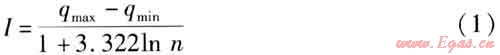 以德州市中心城區(qū)為例進(jìn)行分析,計(jì)算居民生活用氣量指標(biāo)。截至2009年底,德州市中心城區(qū)共有居民用戶15.5×104戶,商業(yè)用戶1014戶,工業(yè)用戶72戶,年耗氣量為1370.6×104m3/a。筆者隨機(jī)抽取了德城區(qū)199戶、高新區(qū)100戶,共計(jì)299戶居民用戶進(jìn)行調(diào)查。由于壁掛爐的用氣量很大,計(jì)算居民生活用氣量指標(biāo)時(shí)主要以無(wú)壁掛爐的用戶作為統(tǒng)計(jì)重點(diǎn)。對(duì)281戶無(wú)壁掛爐用戶的年用氣量進(jìn)行統(tǒng)計(jì),家庭人口平均為3.3人/戶。統(tǒng)計(jì)學(xué)中的組距計(jì)算公式為:
