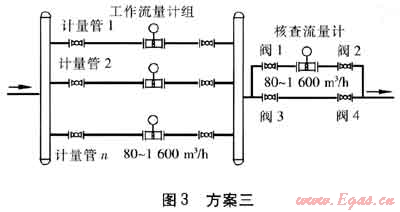 ③ 城市天然氣門站計量系統(tǒng)的設計方案還要充分考慮城市經(jīng)濟發(fā)展對天然氣供氣設備擴容的需求。如果選用渦輪流量計或超聲流量計作為工作流量計,則應該考慮在圖3方案三的工作流量計組中預留擴展旁路。如果選用標準孔板流量計作為工作流量計,這種流量計在雷諾數(shù)符合要求的前提下,可以通過擴大開孔直徑、調整差壓上限等方法,在一定范圍內解決擴容的問題。