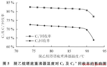 脫乙烷塔底重沸器溫度對C3及C3+回收率的影響如圖5所示。從圖5可知,隨著脫乙烷塔底重沸器溫度的升高,C3及C3+回收率隨之緩慢下降,但當溫度達到90℃時回收率會加速下降。