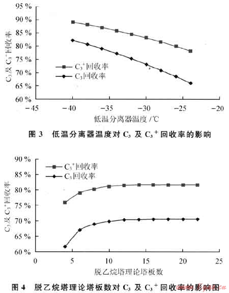 低溫分離器溫度對C3及C3+回收率的影響如圖3所示。由圖3可知,低溫分離器溫度越低,C3及C3+回收率就越高?;厥章蕦Φ蜏胤蛛x器溫度的敏感性較高[3],但低溫分離器溫度過低,制冷系統(tǒng)的負荷也將增加,同時因乙烷冷凝量的增加導致脫乙烷塔的處理負荷也會相應增加。