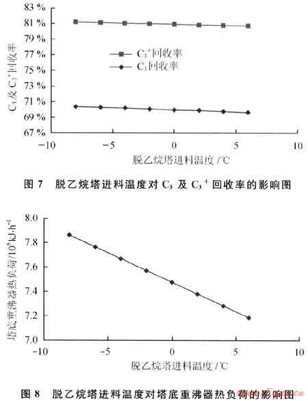 脫乙烷塔的進料溫度對C3及C3+回收率和塔底重沸器熱負荷的影響如圖7、8所示。從圖7、8可以看出,隨著進料溫度增加,C3及C3+回收率下降,塔底重沸器的熱負荷也隨之降低。這是因為進料溫度增加,帶入了更多的熱量,從而使再沸器熱負荷減少。因脫乙烷塔塔頂沒有冷凝器,在進料帶入更多熱量后,脫乙烷塔塔頂溫度升高,部分C3及C3+被帶走,導致C3及C3+回收率下降。