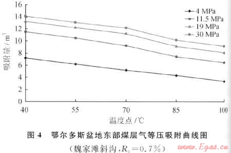 已有研究表明,等壓條件下不同煤階煤的吸附量隨溫度增加均減小[7~10]。鄂爾多斯盆地東部煤層氣吸附實(shí)驗(yàn)顯示,在等壓條件下,煤的甲烷吸附量隨溫度增高呈線(xiàn)性降低,高溫高壓階段溫度增加引起的吸附量降低更為顯著(圖4)。