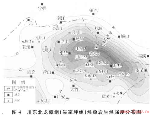 川東北地區(qū)龍?zhí)督M(吳家坪組)泥頁巖呈區(qū)域性分布,在元壩地區(qū)該地層過渡為吳家坪組。其暗色泥灰?guī)r及黑色泥質(zhì)巖厚40~80m;總有機(jī)碳含量值變化在0.27%~7.20%范圍,平均值為2.90%(元壩3井)。本區(qū)該套烴源巖有機(jī)質(zhì)類型以混合型為主,在早侏羅世進(jìn)入生油高峰期,中侏羅世末達(dá)到生氣演化期,現(xiàn)今實(shí)測Ro值大多在2%~3%之間,有機(jī)質(zhì)處于過成熟干氣演化階段,生氣強(qiáng)度主要分布在20×108~30×108m3/km2之間(圖4),具有形成大氣田的氣源條件。