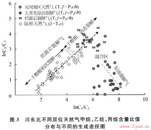 元壩氣田長興組儲(chǔ)層中普遍見有固體瀝青,表明地史上形成過古油藏并發(fā)生了原油裂解作用。根據(jù)大普光和通南巴地區(qū)實(shí)際氣藏分析資料的綜合對比及模擬實(shí)驗(yàn)數(shù)據(jù)[10],發(fā)現(xiàn)這兩類天然氣在lnC1/C2、lnC2/C3比值分布上有明顯差別(圖3)。烴源巖裂解氣的lnC1/C2值較低,大多在6.0之下;而lnC2/C3值較高,均在2.5以上,并隨熱演化程度的增加而變大。原油裂解氣的lnC1/C2值較高,大都在6.0以上;lnC1/C2值較低,大多在2.0之下,與前類天然氣形成區(qū)別。如圖3所示,元壩地區(qū)的飛仙關(guān)-長興組天然氣總體上呈高lnC1/C2、低lnC2/C3值的原油裂解氣組成特點(diǎn)。它們的lnC1/C2值基本上都在6.0以上,且多數(shù)氣樣lnC2/C3值低于2.5,由此可認(rèn)為主要來源于古油藏原油的裂解作用。同時(shí)在圖3中可觀察到,部分氣樣的lnC2/C3值高于2.5,近于烴源巖裂解氣的分布區(qū),意味著這些天然氣中部分氣源直接來自烴源巖。