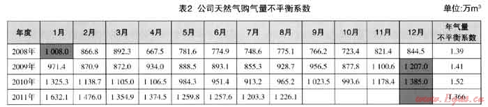 表2是我公司2008年以來4年的每個月份天然氣購氣量數(shù)據(jù)。其中:藍(lán)色是當(dāng)年最高月份購氣量,黃色是當(dāng)年最低月份購氣量,最后一列是“公司年度天然氣購氣量不平衡系數(shù)”。