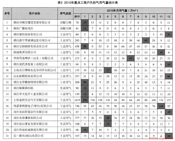 見表3“2010年重點工商戶天然氣用氣量統(tǒng)計表”。表中:藍(lán)色是年度最高月份用氣量,黃色是年度最低月份用氣量。工商戶最高月用氣量主要集中于1月份及12月份,這些月份正是公司供氣高峰時期。工商戶最低月用氣量主要集中于7、8月份,而這些月份正是公司供氣量較低的時間,上述兩個時間段直接決定了公司氣量不平衡系數(shù)的大小。多數(shù)工商戶在公司供氣高峰時也處于供氣高峰期,對公司總氣量不平衡的影響是負(fù)面的,我們稱之為負(fù)面影響氣量用戶。