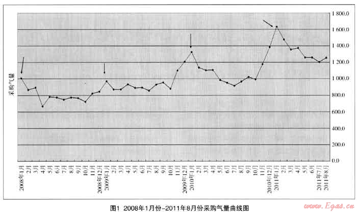 我公司天然氣購銷氣量在不斷增加的同時,氣量的波動程度即氣量的不平衡性也在不斷加大,為了分析問題,我們收集了2008年1月至2011年8月份的天然氣采購氣量及銷售氣量數(shù)據(jù),進(jìn)行了專題分析研究,得出了一些結(jié)論,分析如下: