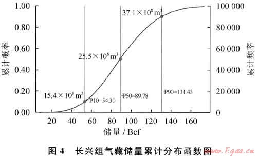 一旦確定代理方程,可以應(yīng)用蒙特卡洛模擬產(chǎn)生地質(zhì)儲量分布。對方程中的每個(gè)項(xiàng),確定其分布函數(shù)。通常來說,儲層頂部深度、孔隙度、孔隙度下限值、氣水界面為三角分布,相變界限為均勻分布[2]。圖4為最終得到七里北長興組氣藏天然氣地質(zhì)儲量:P10=15.4×108m3;P50=25.5×108m3;P90=37.1×108m3。