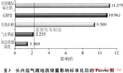 對于七里北長興組氣藏,首先使用了Folded Plackett-Burman(FPB)設(shè)計(jì)生成儲量的代理方程,但由于設(shè)計(jì)方程的曲率值高于能夠接受的上限值,因此又通過D-Optimal設(shè)計(jì)來實(shí)現(xiàn)儲量的代理方程。圖3是使用D-Optimal得到的Pareto不確定性影響圖。