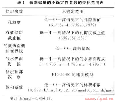 儲層孔隙度在±17%范圍內(nèi)變化。該變化范圍是根據(jù)本區(qū)所有開發(fā)井的非儲層巖層孔隙度的變化范圍計(jì)算得來的。表1列出了不確定范圍的主要參數(shù)。