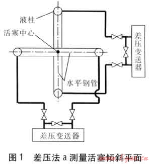 差壓法a測量活塞傾斜平面見圖1。在活塞上采用鋼管做兩個大的水平尺,互相垂直異面交叉,不連通,交叉點為活塞的中心位置。鋼管內(nèi)充有低揮發(fā)性的專用油品,每根鋼管兩端各有一個立管,管內(nèi)充有一定高度的液注,同一根鋼管的兩個立管下部分別與差壓變送器的正負(fù)壓室相連,根據(jù)液柱高差,可計算得出該方向傾斜量的大小。差壓變送器鄰近測壓點安裝。