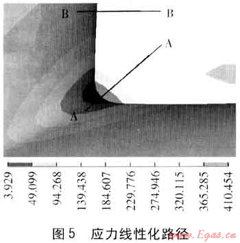 通過分析結(jié)果云圖可以查看管件應(yīng)力的分布情況。本例模型應(yīng)力最大點(diǎn)位于管件焊縫體內(nèi)側(cè),在最高工作壓力為4.0MPa時材料最大主應(yīng)力為410.454MPa。最大應(yīng)力點(diǎn)位于焊縫體內(nèi)側(cè)的圓角過渡處,該區(qū)域?yàn)檎麄€模型受力最集中的區(qū)域且其他區(qū)域的應(yīng)力均遠(yuǎn)遠(yuǎn)小于該區(qū)域,故僅對該區(qū)域進(jìn)行應(yīng)力評定和疲勞評定即可確定模型工作條件下的安全性。