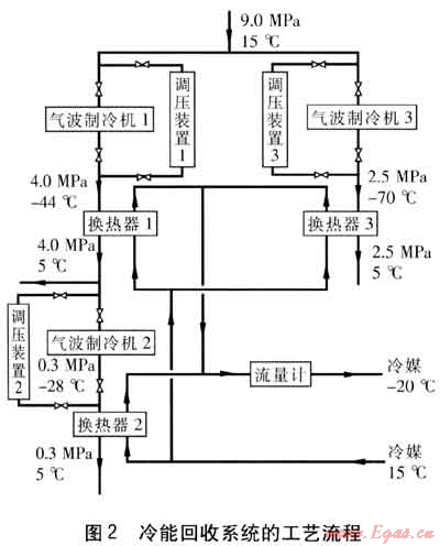 9.0MPa、15℃的天然氣分別進(jìn)入氣波制冷機(jī)1、3獲取冷能,壓力、溫度分別降至4.0MPa、-44℃和2.5MPa、-70℃,經(jīng)過(guò)換熱器1、3后溫度升至5℃。