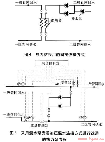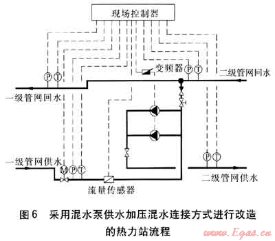 恒源熱力公司自2009年8月開(kāi)始,對(duì)東北線熱網(wǎng)進(jìn)行混水連接、遠(yuǎn)程監(jiān)控技術(shù)改造。已將49座熱力站進(jìn)行整合改造成混水連接熱力站30座,建設(shè)監(jiān)控中心,對(duì)熱力首站和熱力站實(shí)施監(jiān)控。改造項(xiàng)目包括將原有熱力站水-水換熱器、補(bǔ)水泵等設(shè)備拆除,進(jìn)行站內(nèi)管道的改造,安裝自動(dòng)調(diào)節(jié)閥、現(xiàn)場(chǎng)控制器。2009年11月10日,所有改造工作全部完成,至11月30日全部調(diào)試完畢,正式投入運(yùn)行。改造主要考慮采用混水泵旁通加壓、混水泵供水加壓兩種連接方式。