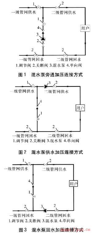 混水連接方式可分為混水泵旁通加壓、混水泵供水加壓、混水泵回水加壓連接方式[4],這3種連接方式分別見(jiàn)圖1~3。通過(guò)改變混水比調(diào)整二級(jí)管網(wǎng)供水溫度,從而改變一級(jí)管網(wǎng)回水溫度,滿足熱力首站二級(jí)側(cè)回水溫度的要求。