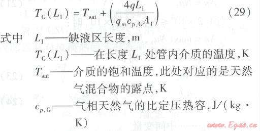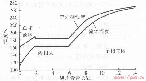 <0.05,說明假設(shè)的管內(nèi)壁溫度Tn正確,即可以進(jìn)行下一步長(zhǎng)的計(jì)算。 取空氣溫度為l0℃,步長(zhǎng)(進(jìn)行一次計(jì)算所取的管道長(zhǎng)度)L=0.1 m,同時(shí)根據(jù)LNG達(dá)到泡點(diǎn)(163.7 K)時(shí)代表單相液區(qū)結(jié)束、天然氣溫度處于露點(diǎn)(211.2 K)與263 K之問時(shí)為單相氣區(qū),也可以計(jì)算出單相液區(qū)和單相氣區(qū)的長(zhǎng)度。