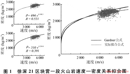 波阻抗等于密度和速度的乘積,而速度與密度存在一定的關(guān)系(如Gardner公式)[9],因此可以通過擬合密度與速度的關(guān)系,將這種關(guān)系代入波阻抗體中,分離出密度來。但不能簡單地套用Gardner公式,因?yàn)镚ardner公式是國外地球物理學(xué)工作者通過對美國墨西哥灣地區(qū)淺層海相地層中巖心樣品分析得到,它更適合于沉積巖,對于徐深氣田徐深21區(qū)塊深層火山巖,應(yīng)該根據(jù)實(shí)際情況擬合適用于該區(qū)的公式模型。通過該區(qū)塊營一段火山巖地層的測井資料,得到如下公式模型(圖1):ρ=494v0.1903,相關(guān)系數(shù)為0.531。然后,通過Jason軟件Function模塊編寫函數(shù),將約束稀疏脈沖波阻抗體轉(zhuǎn)換成密度體。