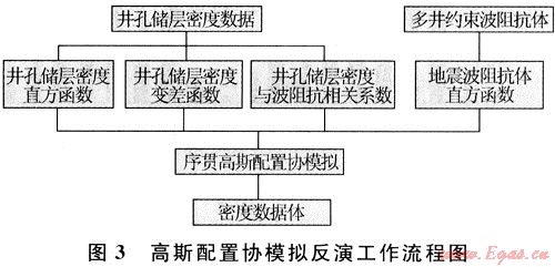 高斯配置協(xié)模擬實(shí)質(zhì)是將地質(zhì)統(tǒng)計(jì)學(xué)理論融入隨機(jī)反演中,隨機(jī)反演在一定地質(zhì)模式指導(dǎo)下進(jìn)行,從而保證反演結(jié)果具有一定的地質(zhì)意義。其具體工作流程(圖3)如下:利用測井密度曲線與波阻抗反演結(jié)果的相關(guān)性,把約束稀疏脈沖波阻抗反演結(jié)果作為隨機(jī)模擬先驗(yàn)信息,使其成為橫向外推的約束條件,把密度曲線作為第一類數(shù)據(jù),波阻抗結(jié)果作為第二類數(shù)據(jù),通過對常規(guī)波阻抗結(jié)果和密度曲線的直方圖、變差函數(shù)分析,用地質(zhì)統(tǒng)計(jì)學(xué)原理反演出第一類數(shù)據(jù),進(jìn)而得到密度的模擬結(jié)果。