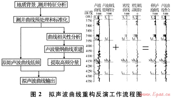 將密度曲線的高頻信息加入到速度曲線的低頻背景中去,得到具有密度信息的偽速度曲線,然后將其與密度曲線乘積,得到擬波阻抗曲線,其流程見圖2。原始波阻抗與密度的相關(guān)系數(shù)為0.63,重構(gòu)后波阻抗與密度的相關(guān)系數(shù)為0.78,重構(gòu)后波阻抗與原始波阻抗的相關(guān)系數(shù)為0.81。可見重構(gòu)后,密度與擬聲波曲線得到的波阻抗相關(guān)性得到了提高。重構(gòu)后的聲波曲線完成的合成記錄與原始合成記錄一致,質(zhì)量更好。