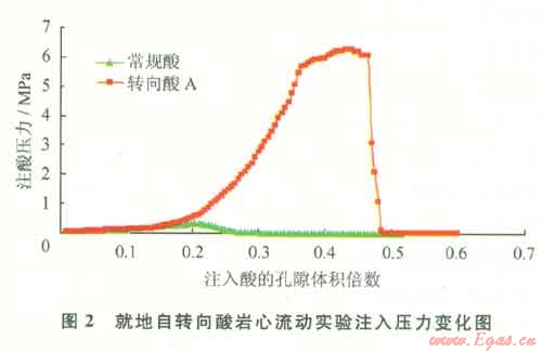 巖心實驗結(jié)果表明:就地自轉(zhuǎn)向酸注入壓力先隨注入體積的增大而增大,當注入一定量時,注入壓力急劇升高,最大增加到6.3MPa,是初始注酸壓力0.1MPa的近60倍;自轉(zhuǎn)向的注入壓力是常規(guī)酸注入壓力的20倍左右,自轉(zhuǎn)向酸具有明顯的轉(zhuǎn)向性能(圖2)。