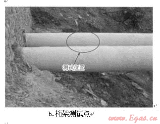 在中國(guó)石化中原油田分公司普光氣田公司(以下簡(jiǎn)稱普光氣田)的協(xié)助下,根據(jù)測(cè)試位置的要求,最終選取了斜拉橋和桁架處作為管道積液測(cè)試位置(圖5)。