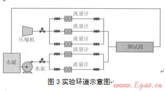實(shí)驗(yàn)室的實(shí)驗(yàn)環(huán)道如圖3所示,實(shí)驗(yàn)系統(tǒng)采用GA45VSD型全封閉低噪聲螺桿式空氣壓縮機(jī),其額定功率為45 kW,最大工作壓力為l.3 MPa,排氣量為78~354 m3/h。水泵采用ZS65—40—200離心泵,量程為25 m3/h,揚(yáng)程為62 m。氣體計(jì)量采用Y040一EALSS4 0D渦旋流量計(jì)。液體流量計(jì)量采用Emer—son CMF型質(zhì)量流量計(jì)。實(shí)驗(yàn)環(huán)道口徑為40 mm,測(cè)試段外徑為200 mm,壁厚為l5 mm。