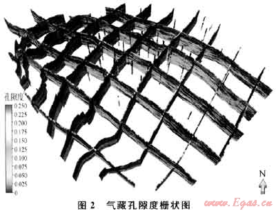 該氣藏孔隙度與含氣飽和度、滲透率相關系數(shù)較高,以孔隙度模型作為約束條件,采用同樣的建模方法建立含氣飽和度和滲透率模型。