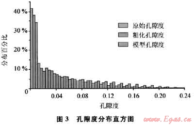 2) 統(tǒng)計特征對比。對比建立的孔隙度、滲透率、含氣飽和度等儲層參數(shù)的模型統(tǒng)計特征和輸入的原始測井解釋數(shù)據(jù)及其粗化后的數(shù)據(jù)(圖3),可以看出地質模型儲層參數(shù)與原始數(shù)據(jù)的統(tǒng)計分布特征基本一致。