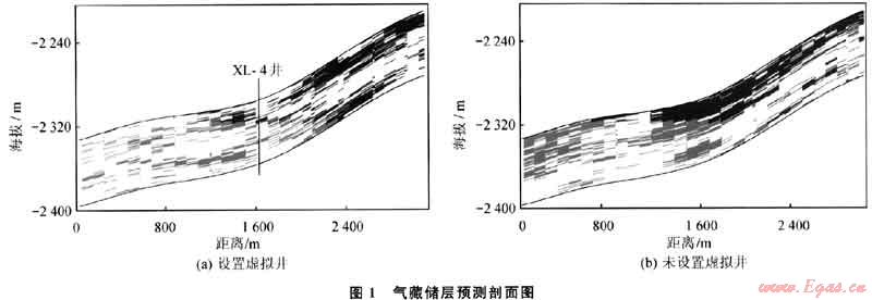 研究結果表明,根據(jù)地震資料結合鉆井及地質綜合研究構建合理“虛擬井”可以有效地解決氣藏邊部井網(wǎng)稀疏區(qū)域井間隨機性強的缺點,能夠進一步提高儲層地質模型的精度。將采用和不采用“虛擬井”技術建立的儲層分布模型進行對比可以看出,其儲層的發(fā)育程度和在空間上出現(xiàn)的位置具有很大的不同(圖1),表明僅依靠地震儲層反演成果約束建立的地質模型在邊部井網(wǎng)稀疏的地方不能反映薄儲層在縱橫向上分布的特征。