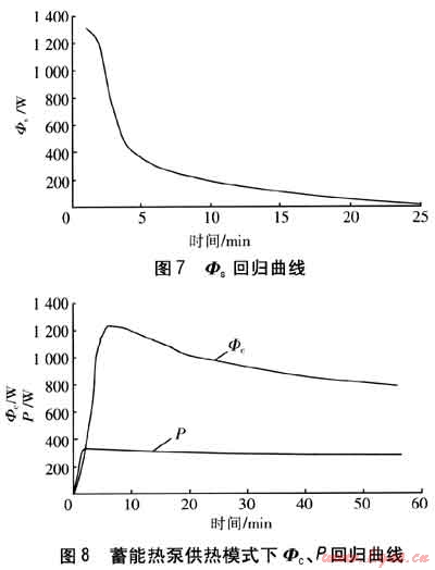 由實(shí)驗(yàn)結(jié)果擬合的蓄能熱泵供熱模式下Φc、P回歸曲線見(jiàn)圖8。與蓄冷模式相比較,由于冷凝溫度的升高,壓縮機(jī)的功率增大。Φc的變化趨勢(shì)與蓄冷模式類(lèi)似,但是由于初始溫度高于蓄冷模式,相變材料相應(yīng)可提取的液態(tài)顯熱量增加。因此,蓄能熱泵供熱模式在達(dá)到與蓄冷模式相同的蒸發(fā)壓力水平時(shí),所用時(shí)間相應(yīng)延長(zhǎng)。