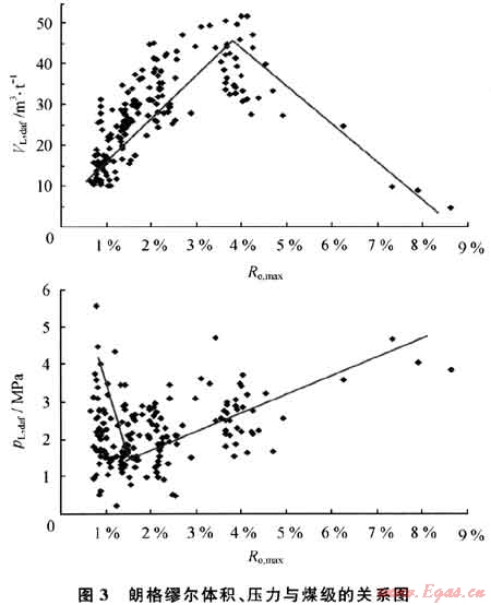 2) 華北地區(qū)石炭 二疊系各煤類朗格繆爾體積與煤級(jí)的關(guān)系呈現(xiàn)出兩段式變化模式,即煤化程度在Ro,max<4%之前,VL,daf隨Ro,max的增加而增大,當(dāng)Ro,max>4%后,VL,daf隨Ro,max的增加而減少;朗格繆爾壓力與煤級(jí)關(guān)系復(fù)雜,數(shù)據(jù)十分離散。
