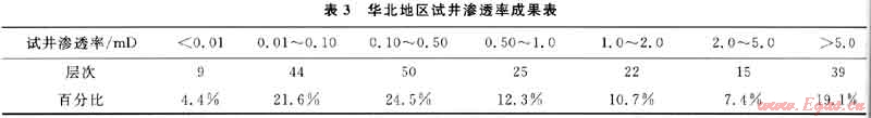 4) 華北地區(qū)超低滲透儲(chǔ)層占26.0%,低滲透儲(chǔ)層占36.8%,中滲透儲(chǔ)層占18.1%,高滲透儲(chǔ)層占19.1%,試井滲透率總體隨埋深的增加而減少。