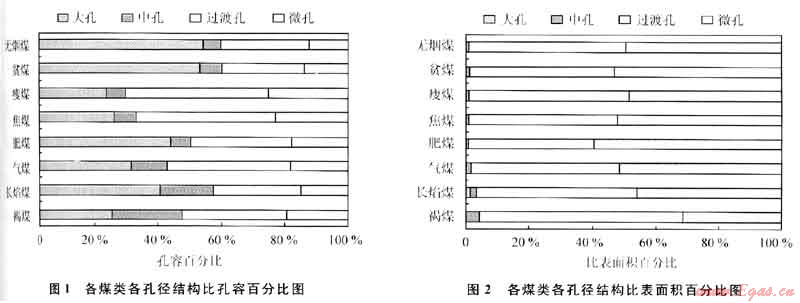 1) 華北地區(qū)褐煤、長(zhǎng)焰煤各孔徑結(jié)構(gòu)中比孔容分布較均勻,其他煤類中大孔、過渡孔占較高比例,中孔不發(fā)育;各煤類各孔徑結(jié)構(gòu)中比表面積微孔、過渡孔占絕對(duì)多數(shù)。