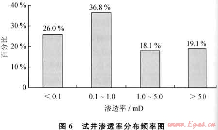超低滲透儲(chǔ)層(滲透率小于0.1mD)占26.0%,低滲透儲(chǔ)層(滲透率介于0.1~1.0mD)占36.8%,中滲透儲(chǔ)層(滲透率介于1.0~5.0mD)占18.1%,高滲透儲(chǔ)層(滲透率大于5.0mD)占19.1%(圖6、表3)。試井滲透率總體隨埋深的增加而減少(圖7)。